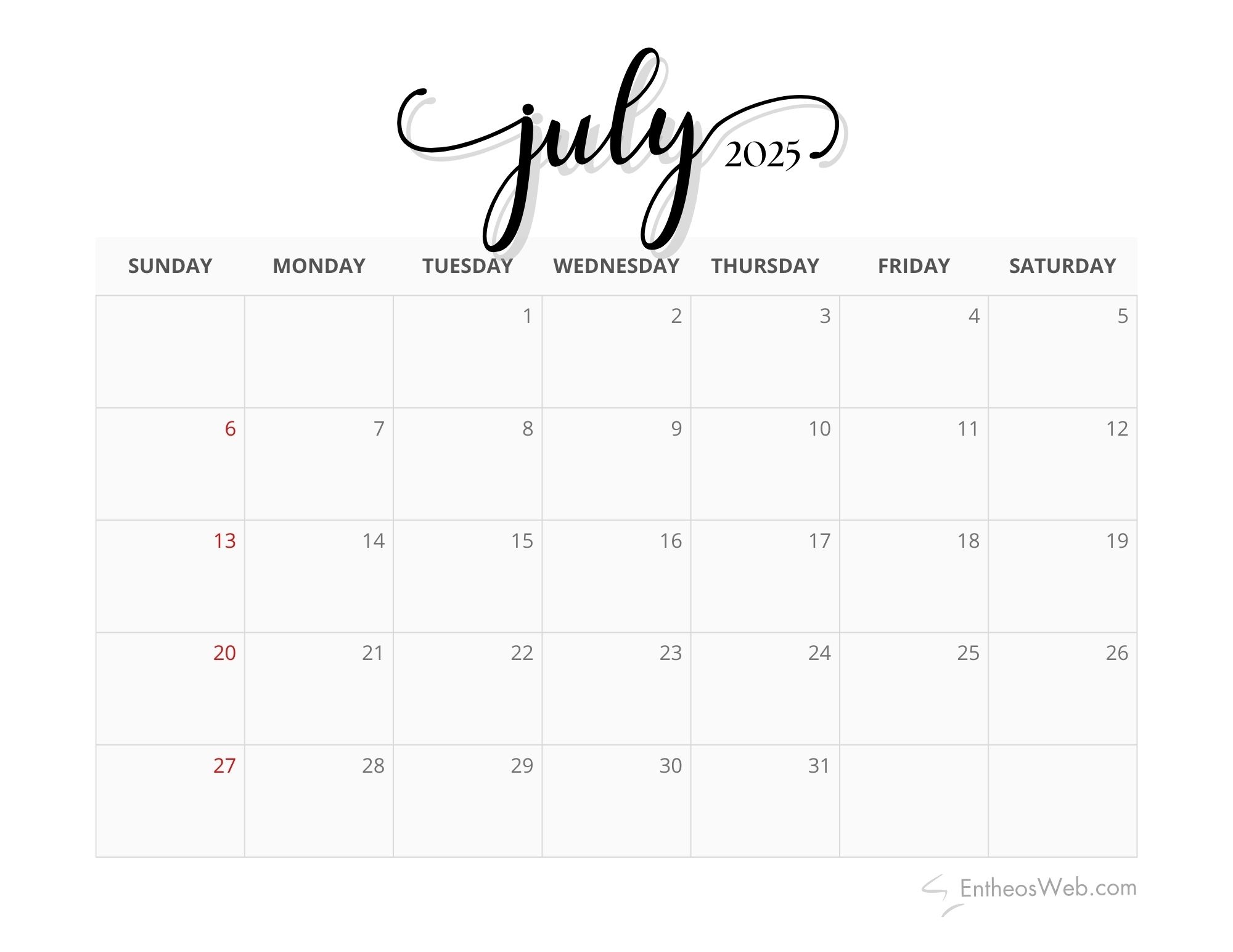 Calligraphy July 2025 Calendar In EPS JPG SVG Excel Word Illustrator Google Docs Google Sheets To Download Template