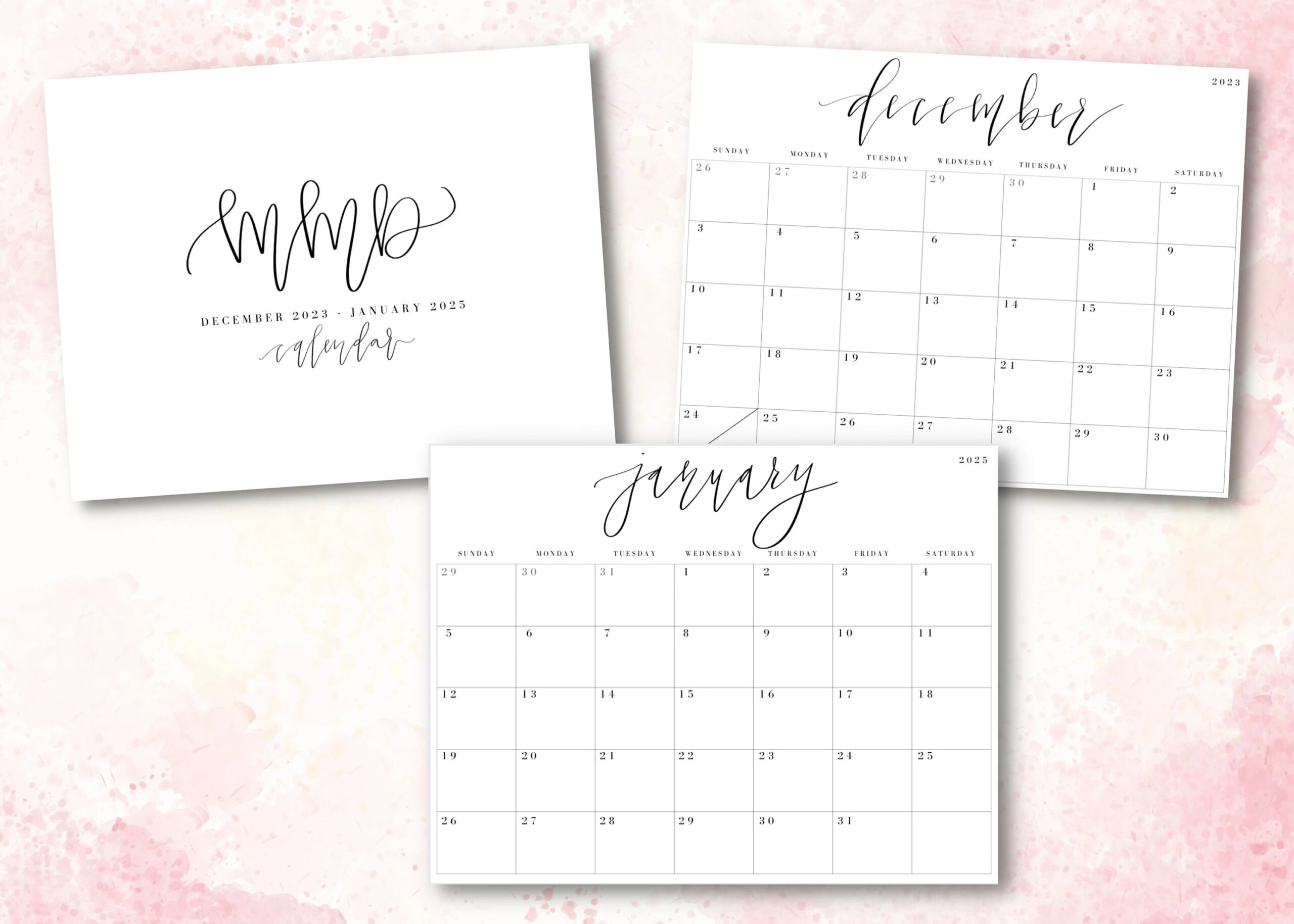 Monthly Calendar December 2023 January 2025 Calligraphy Minimal Instant Download PDF Printable Calendar Horizontal Etsy