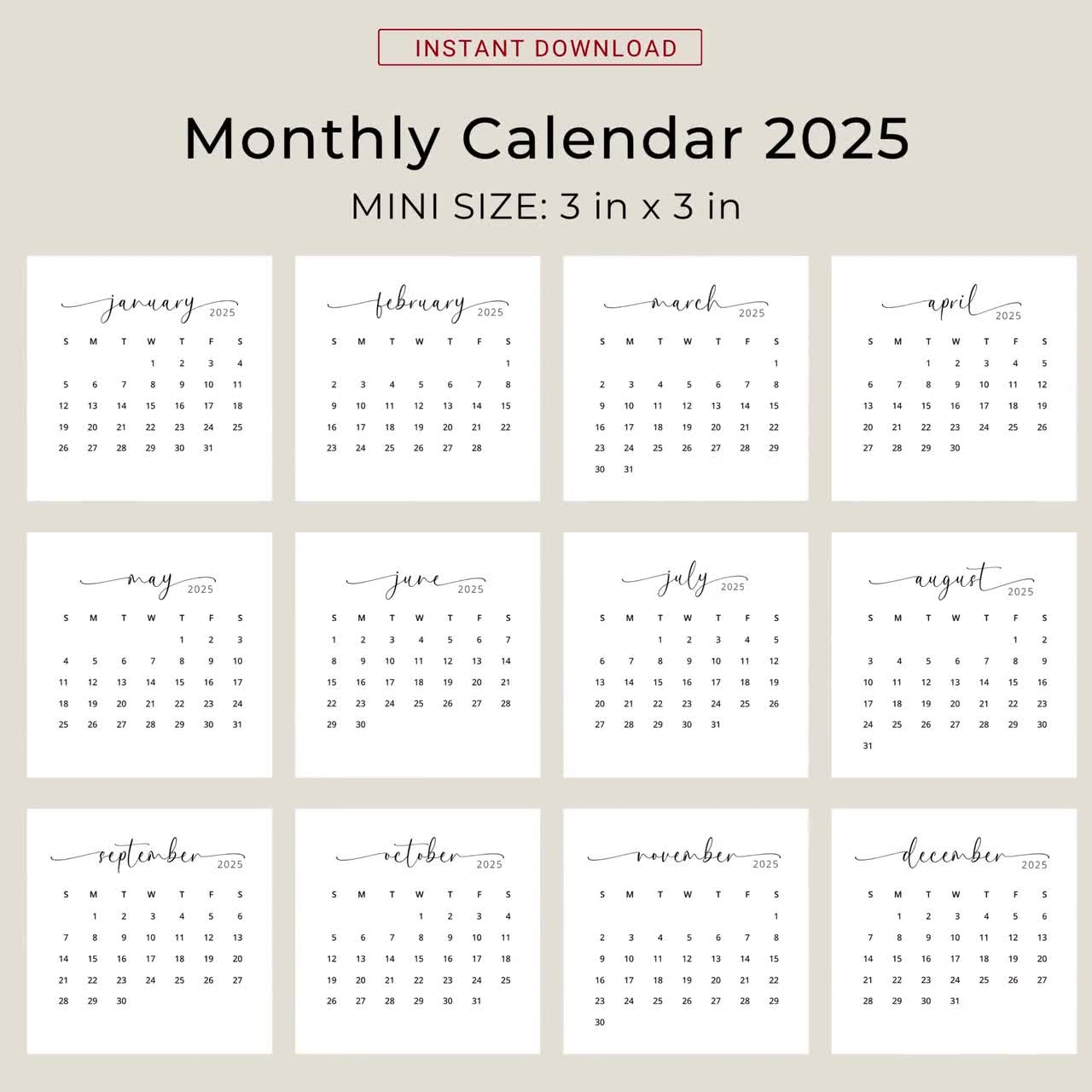 2025 3×3 Mini Calendar 2025 Calendar Card 2025 Pocket Calendar Elegant Printable Calendar Mini 3×3 Inch Calendar PDF Sunday Monday Start Etsy