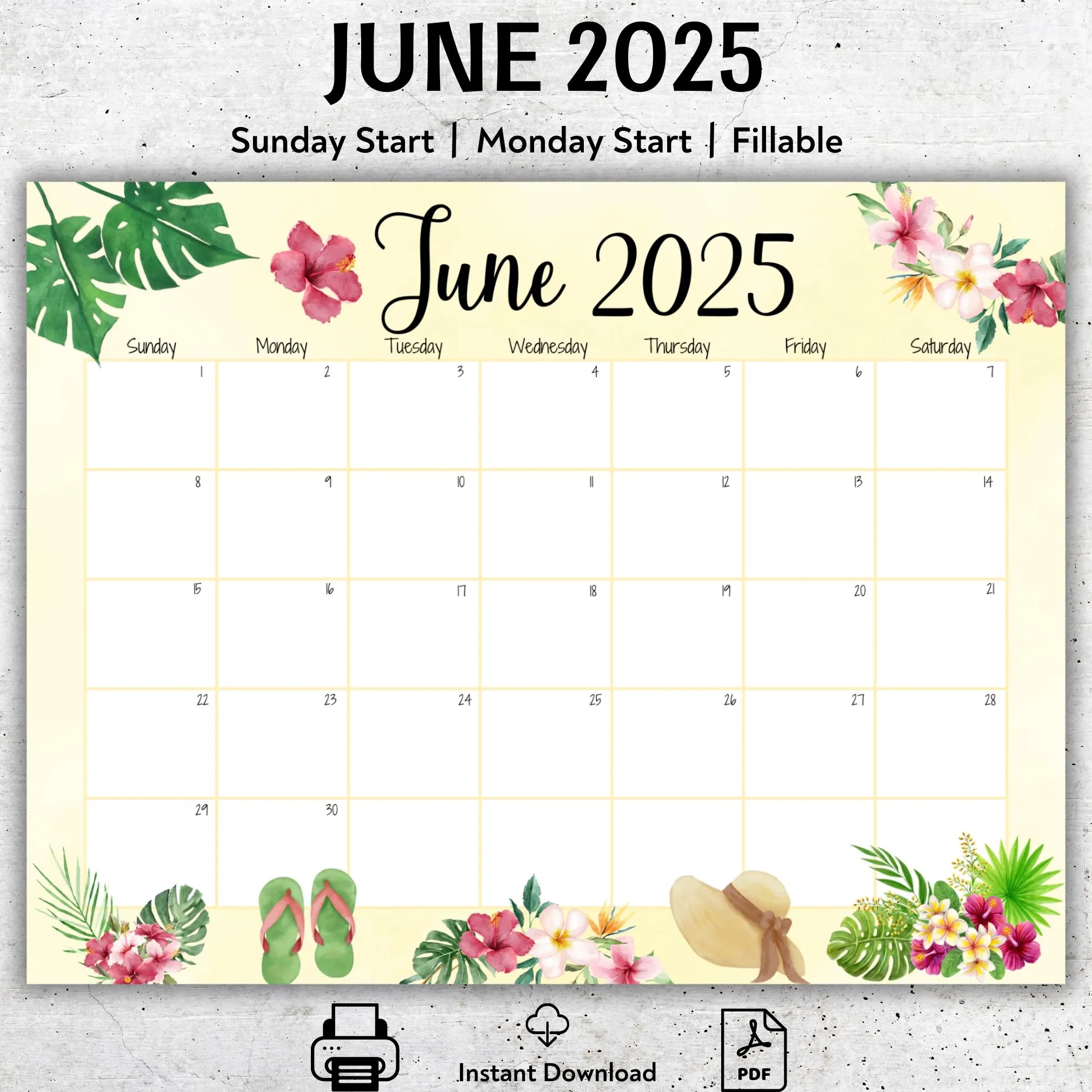 Printable June 2025 Calendar Tropical Theme Sunday And Monday Start Options Fillable US Letter PDF Instant Download Editable Planner Etsy