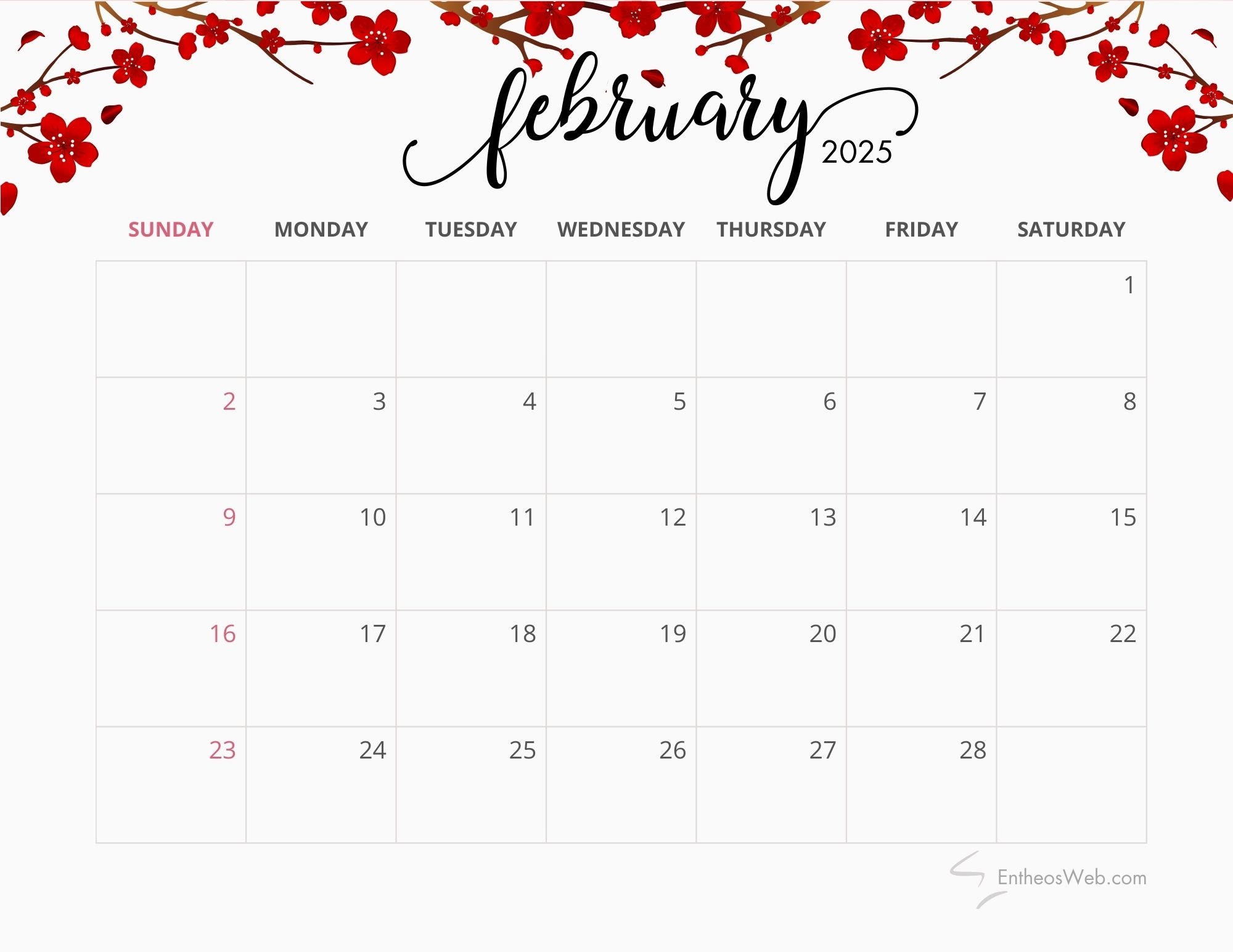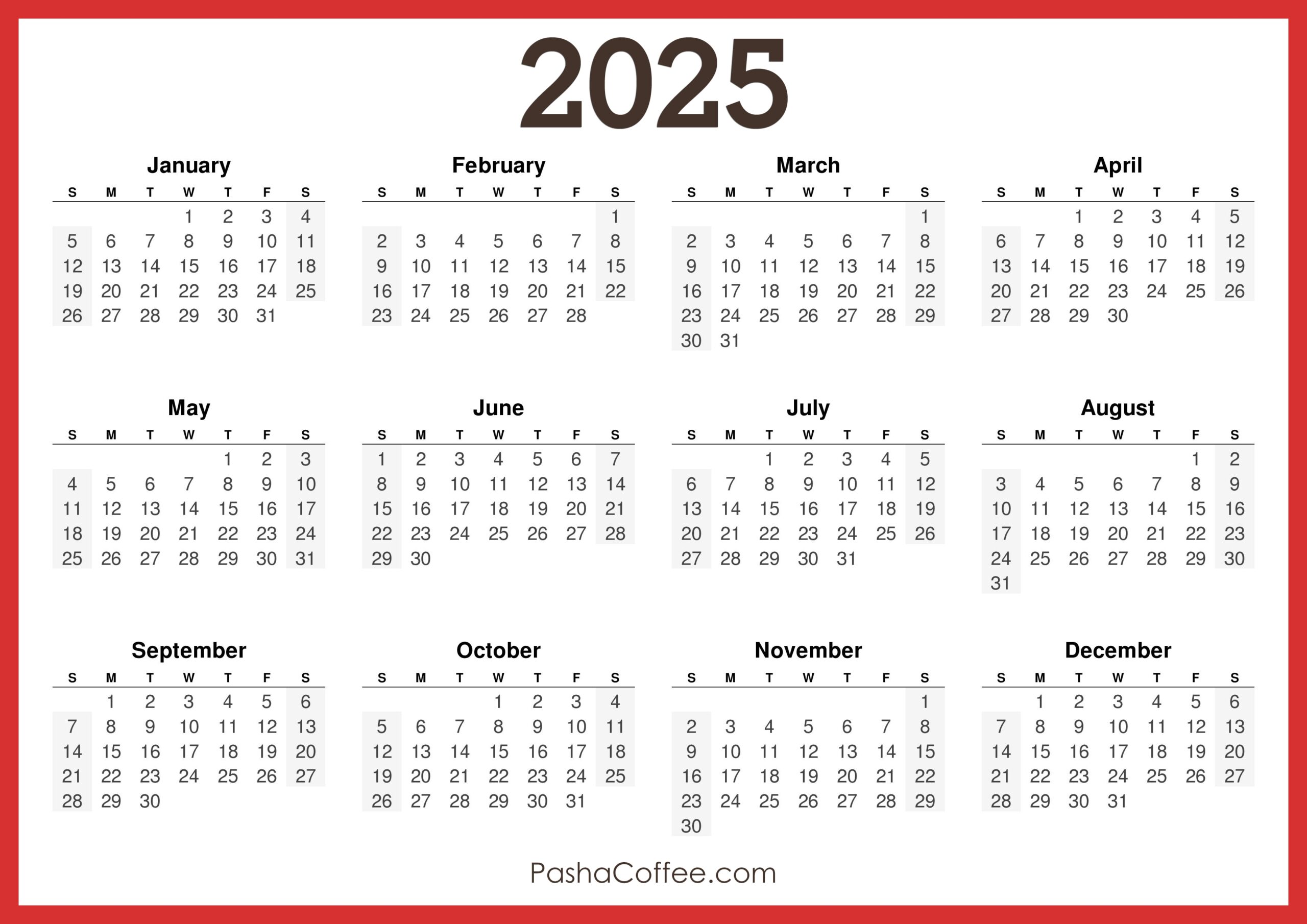 2025 Calendar Printable Free Horizontal Red PashaCoffee