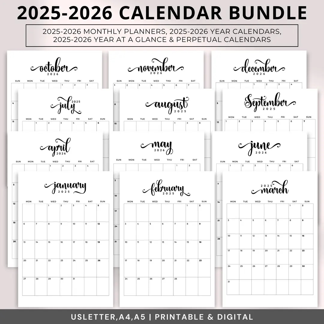 Monthly Planner 2025 2026 Printable 2025 2026 Calendar Bundle editable Portrait Monthly Calendars perpetual Calendars year At A Glance A4 Etsy