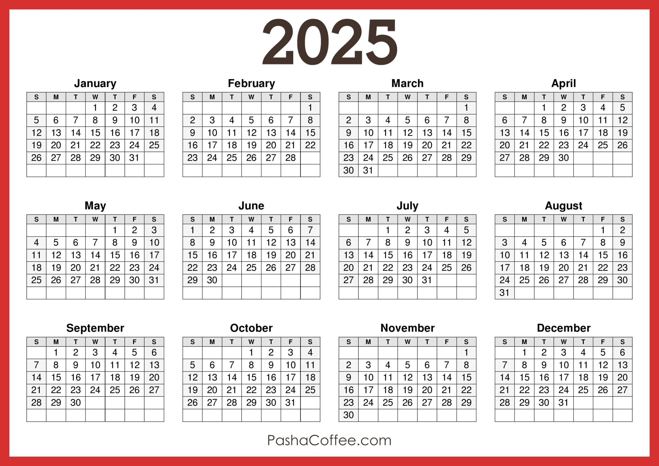2025 Calendar Printable Free Horizontal Red PashaCoffee