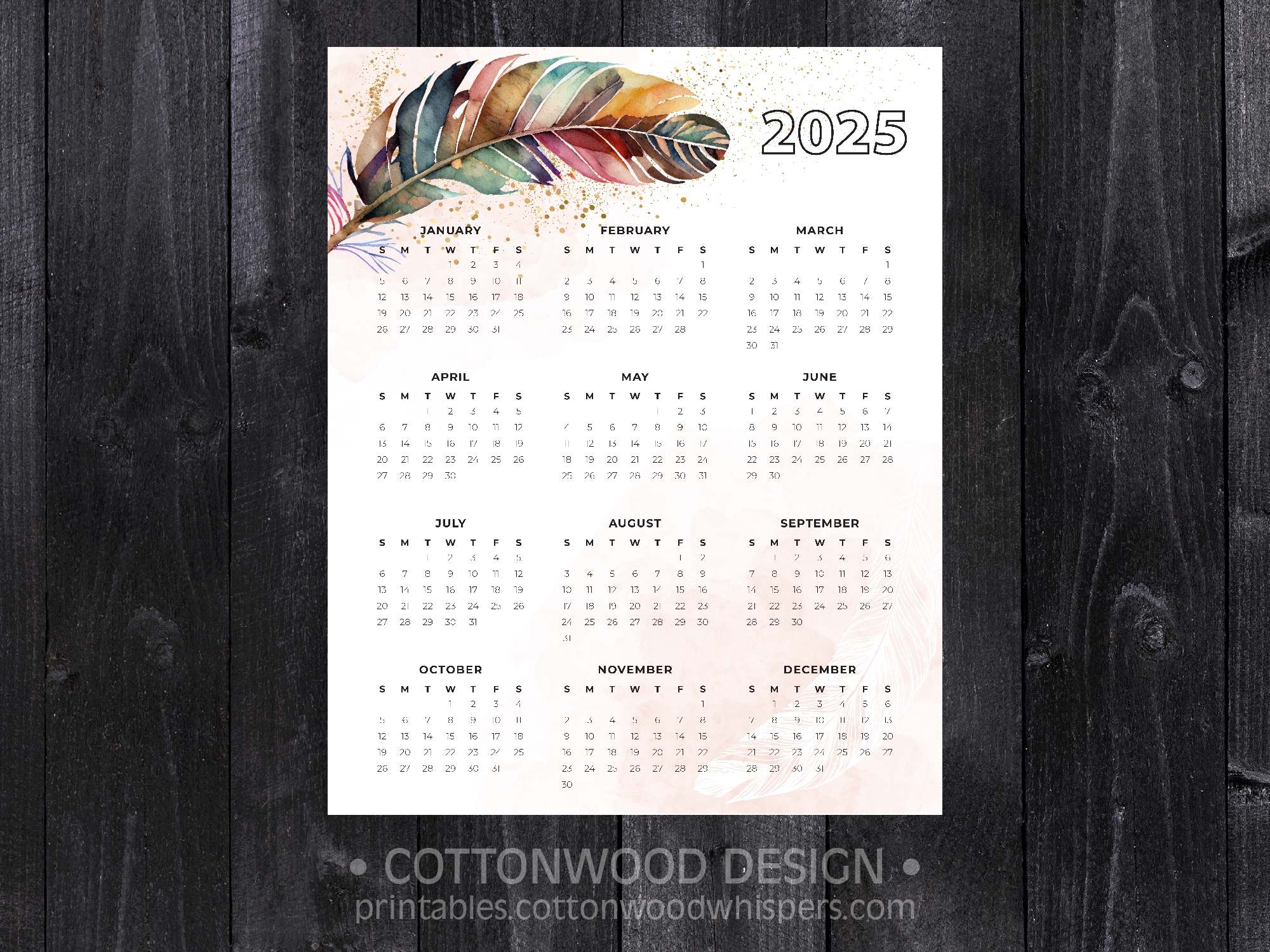 2025 Printable Calendar Year At A Glance Boho Feather Watercolor 16 X 20 8 X 10 Instant Download Portrait Planner Printables By Cottonwood Whispers