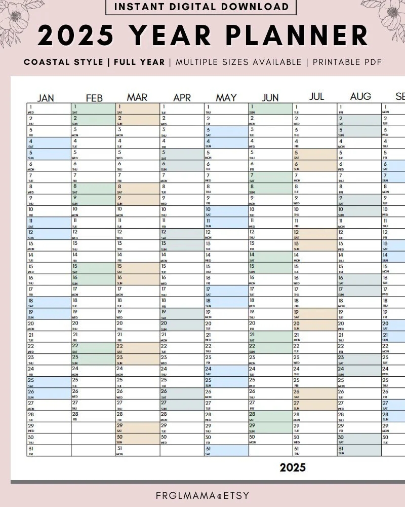 2025 Year Planner Printable Yearly Planning Calendar Calendar Poster 2025 Digital Calendar 2025 Calendar 2025 Planner Year At A Glance Etsy
