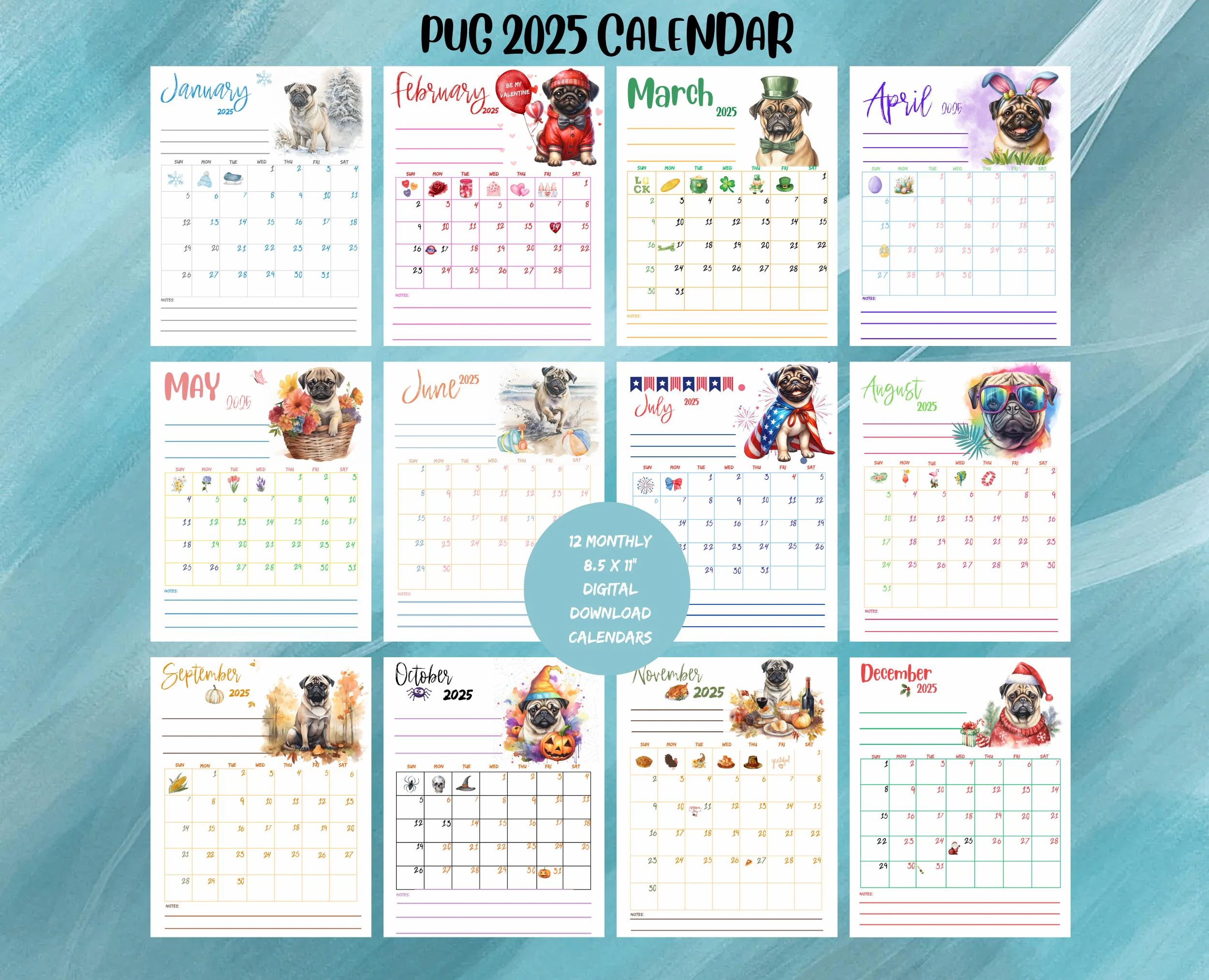 Printable 2025 Calendar For Pug Mom Instant Christmas Gift For Dog Dad Home School Calendar 12 Month Desk Planners For Students Etsy