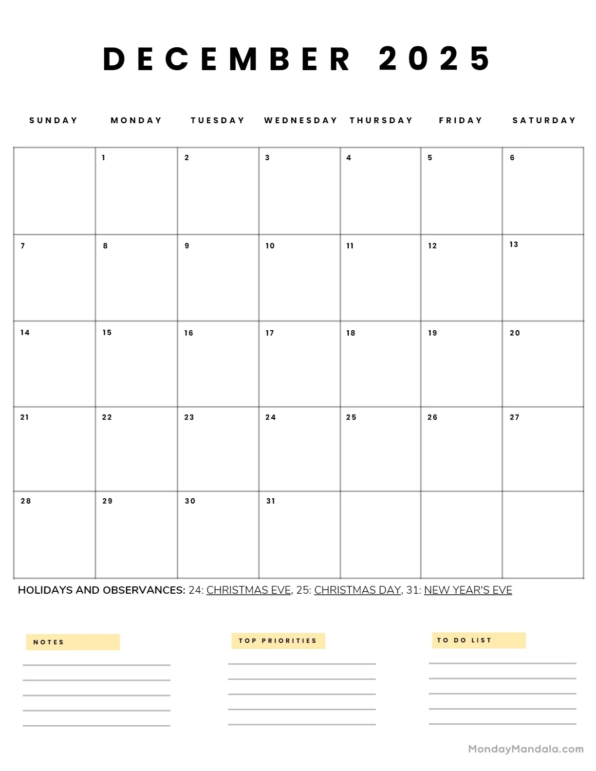 Whether you prefer a traditional monthly layout or a more detailed weekly planner, a blank 2025 calendar for December gives you the flexibility to plan your month your way. You can color-code different activities, set reminders, and keep track of deadlines with ease.