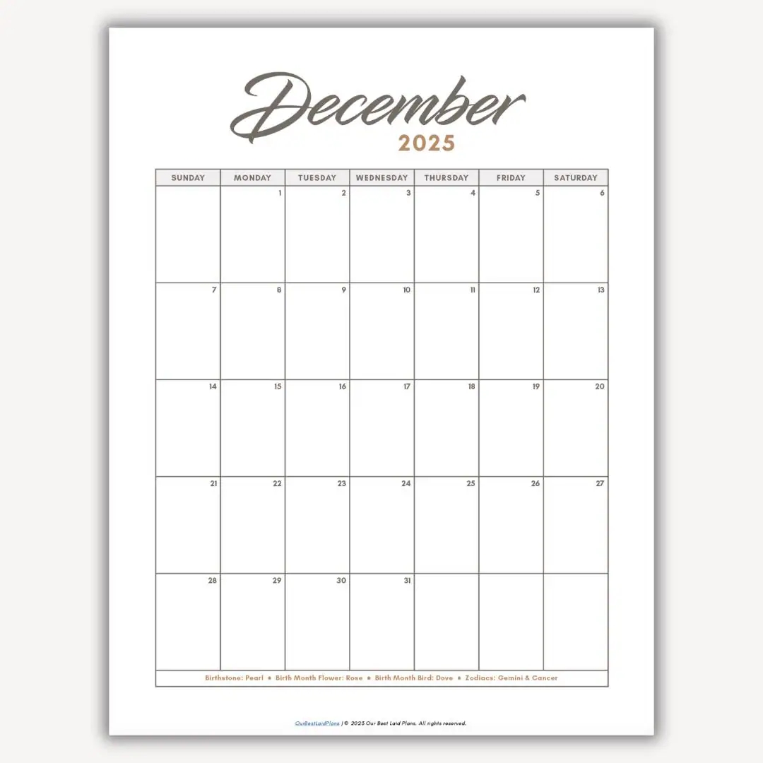 Don’t let the holiday chaos overwhelm you. Take control of your schedule with a blank 2025 calendar for December. Whether you’re planning family gatherings, shopping for gifts, or scheduling holiday travel, having a calendar on hand can help you stay on top of it all.