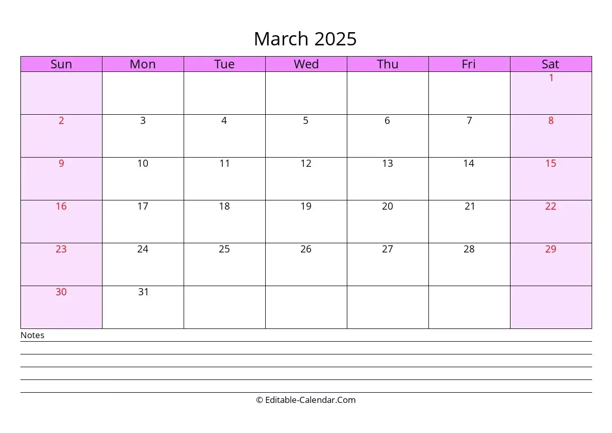 Editable Calendar March 2025 In Excel Word PDF
