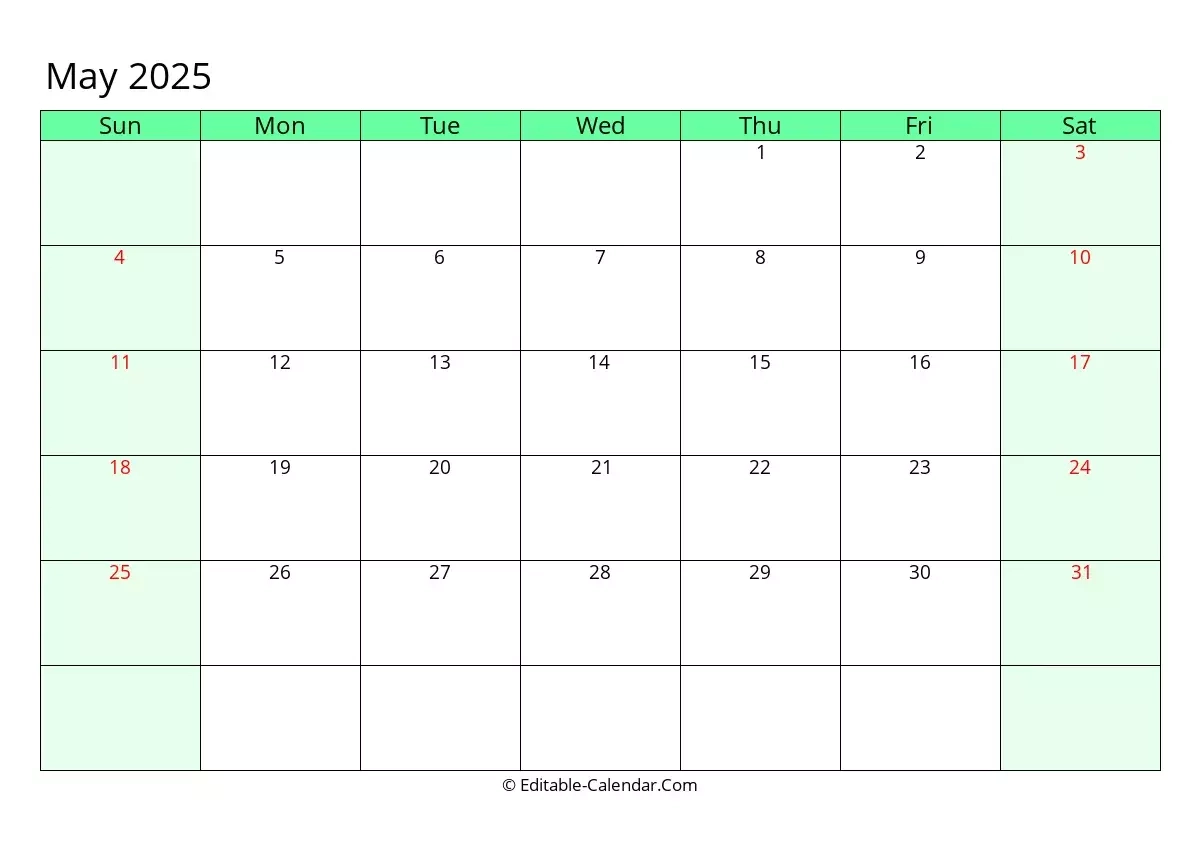Editable Calendar May 2025 In Excel Word PDF