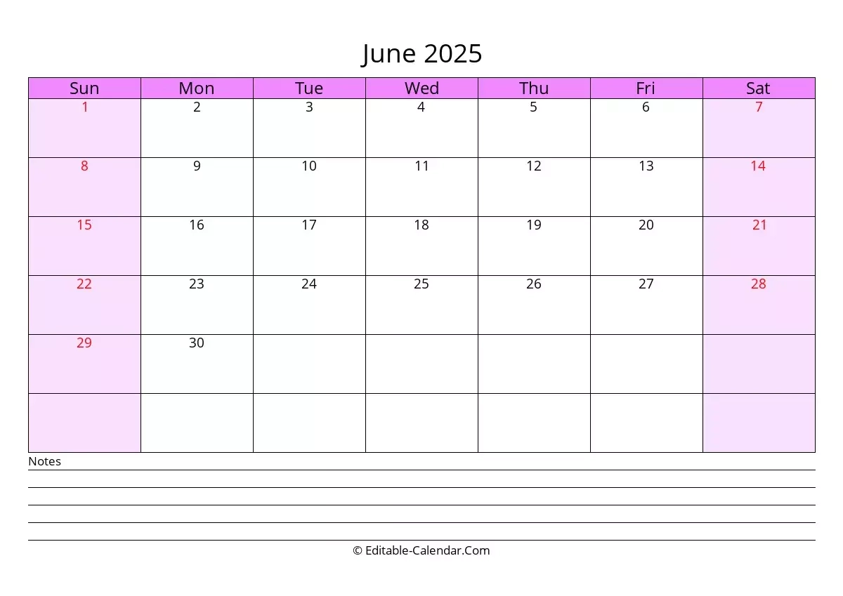 Editable Calendar June 2025 In Excel Word PDF