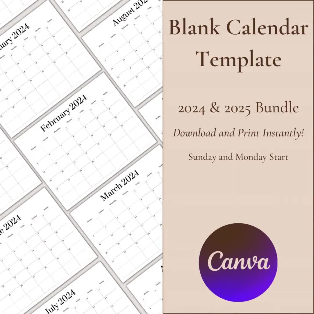 2024 And 2025 Blank Calendar Bundle Yearly Calendar Editable Calendar Digital Calendar Monday Start Calendar Sunday Start Calendar Etsy