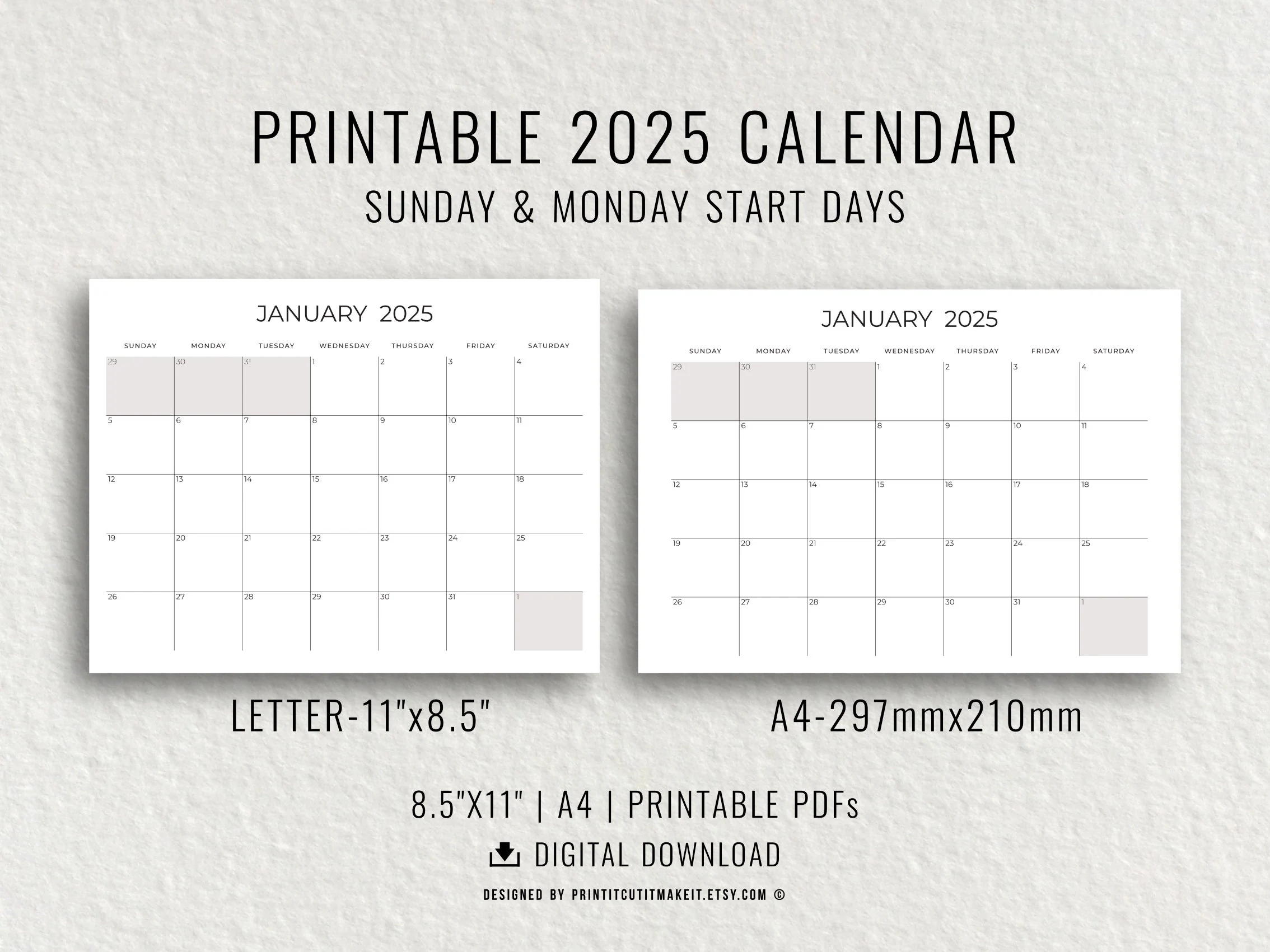 2025 Printable Calendar Blank Calendar Template 8 5×11 A4 Sunday Start Monday Start Landscape Orientation PDF Digital Download Etsy