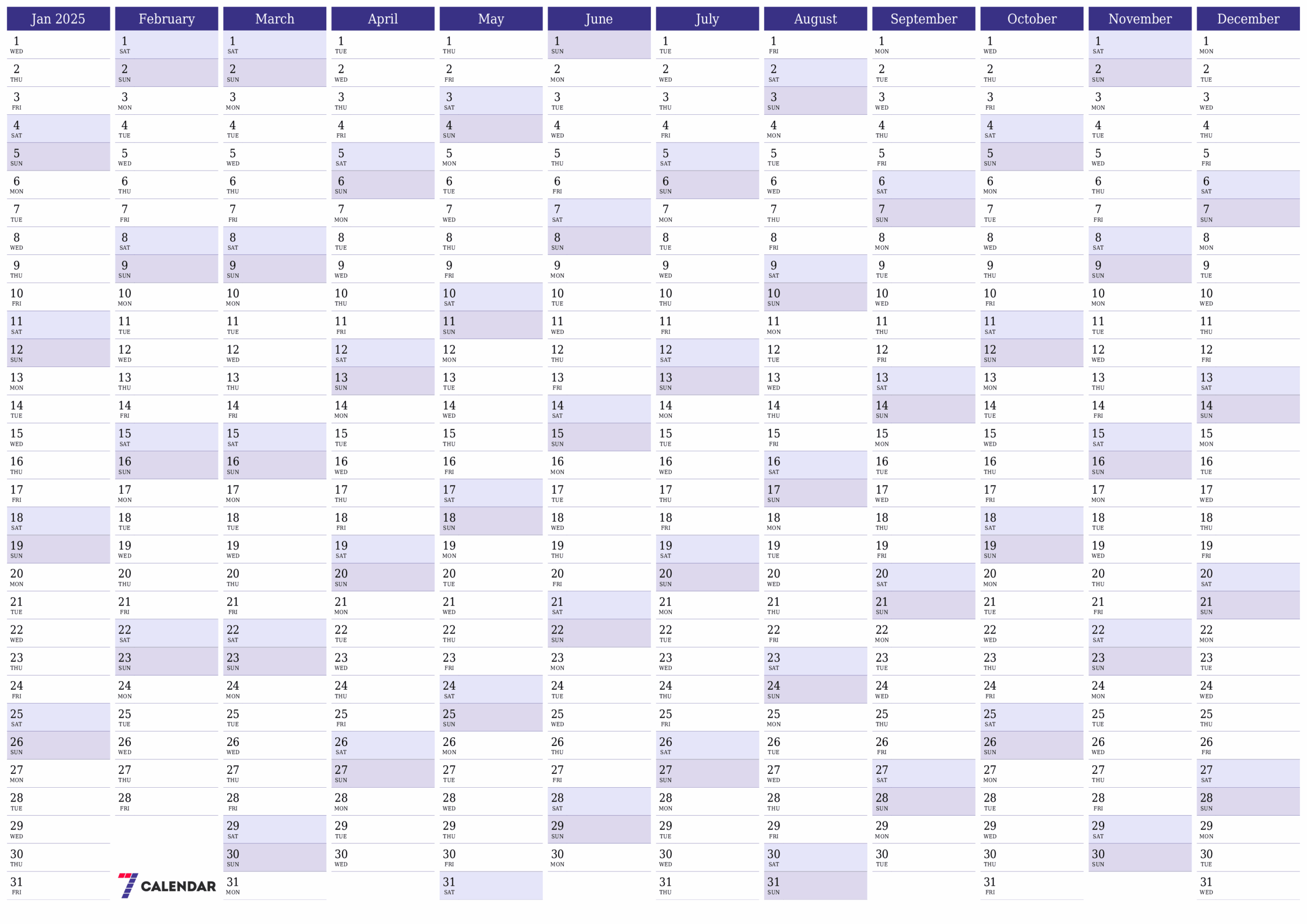 Blank 2025 Yearly Calendar Printable