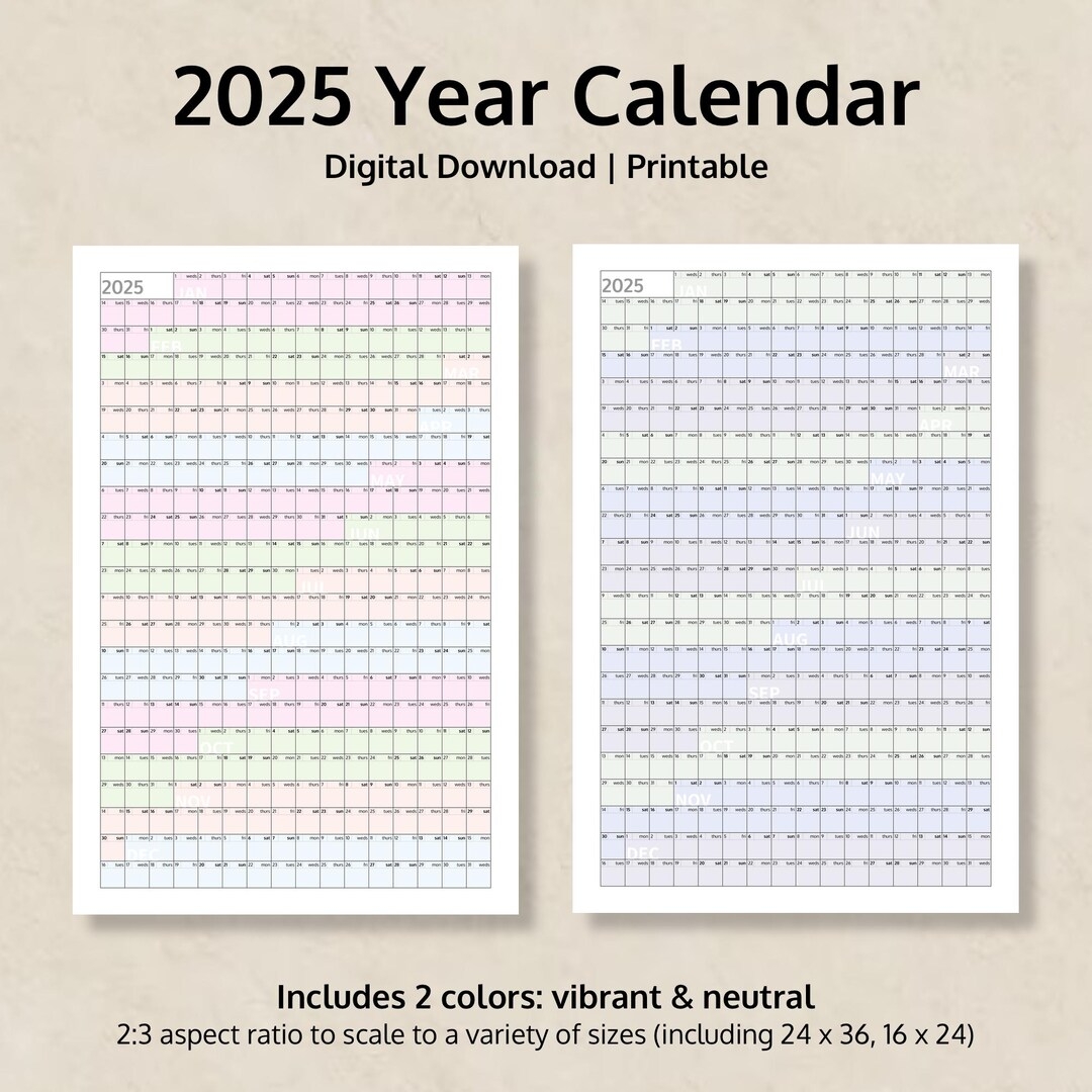 2025 Full Year Calendar Printable vertical Layout Color And Neutral Year At A Glance 2025 Calendar Yearly Calendar Digital Calendar Etsy