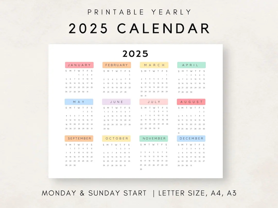 2025 Yearly Calendar Printable Calendar 2025 Calendar 2025 Digital Calendar Year At A Glance 2025 Annual Calendar Yearly Wall Calendar Etsy