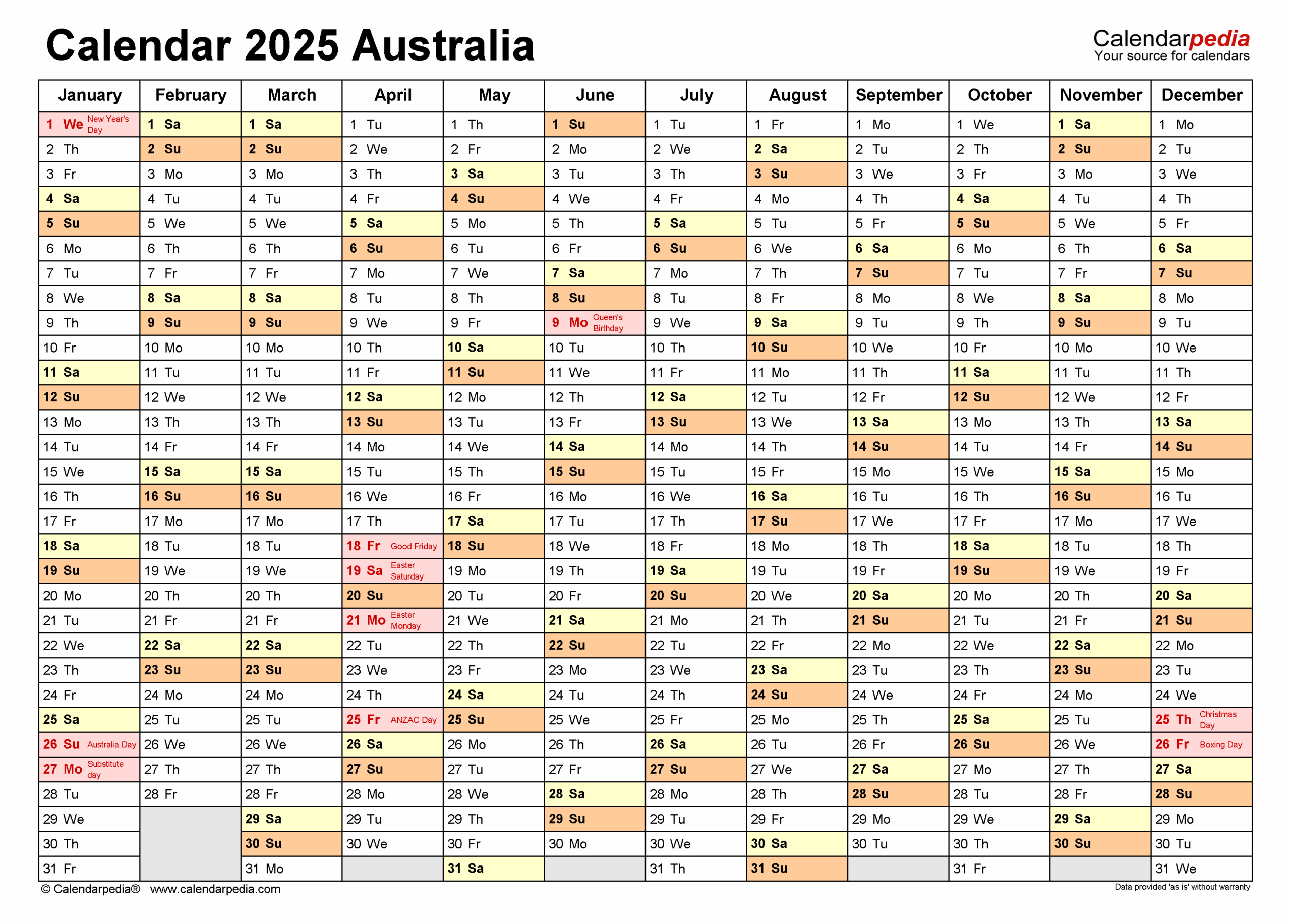 Australia Calendar 2025 Free Printable Word Templates