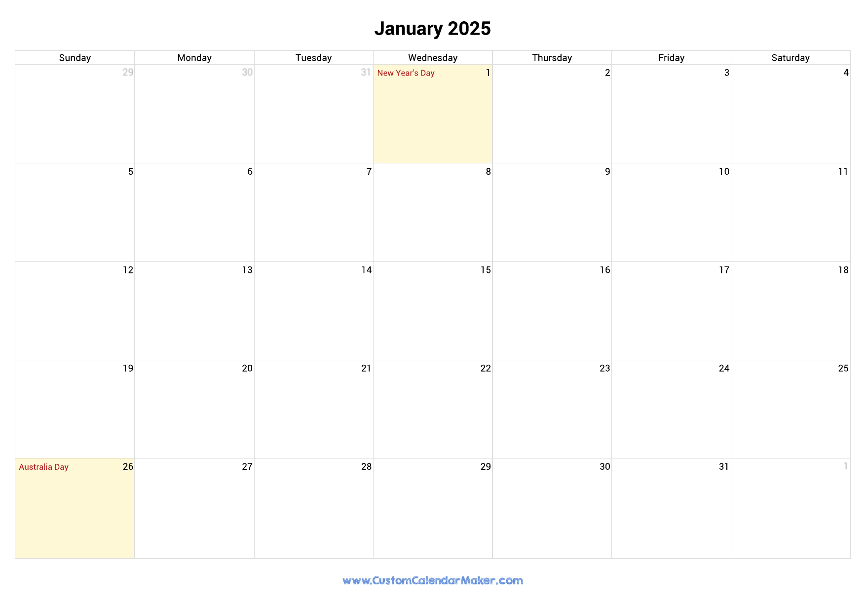 January 2025 Printable Calendar With Australia Holidays Custom Calendar Maker