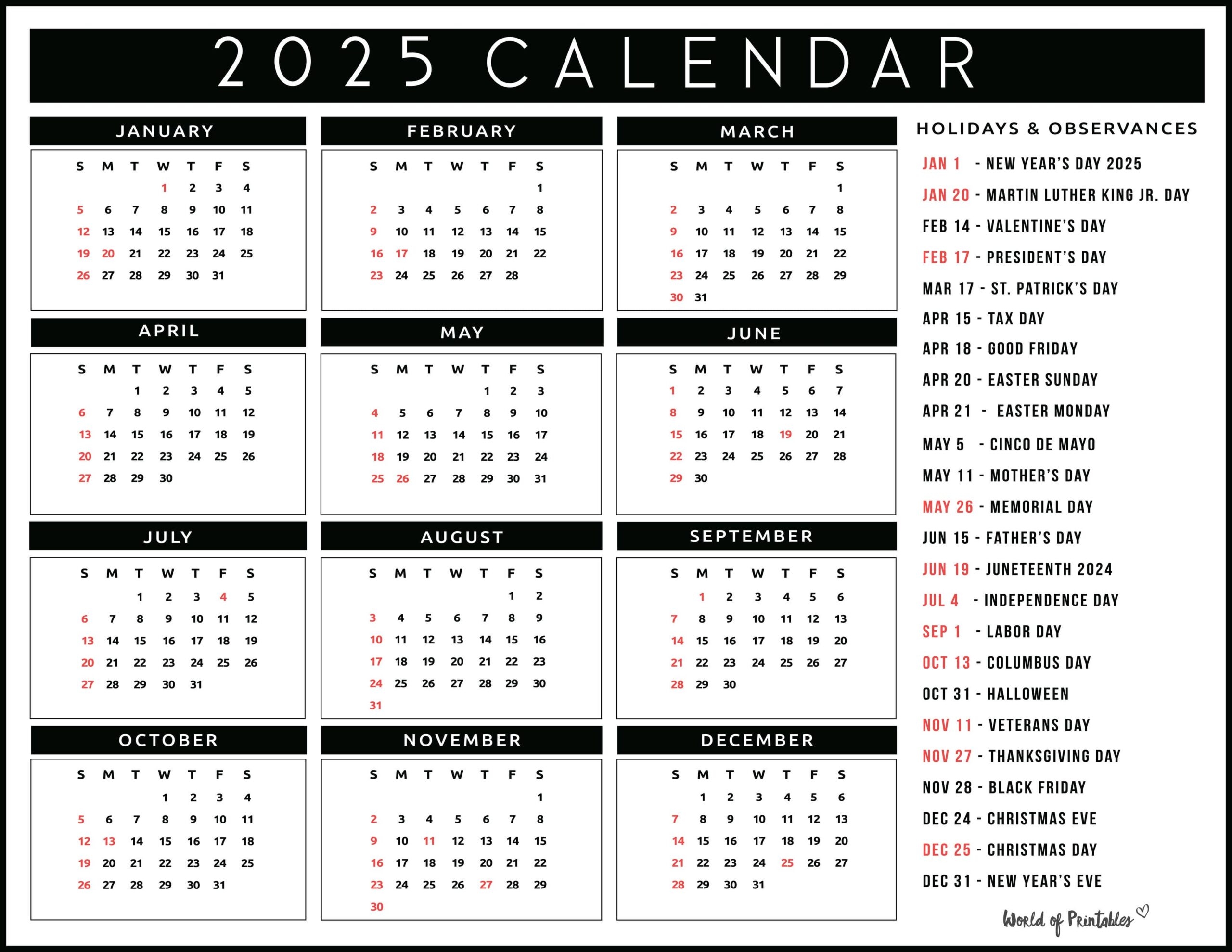 2025 Calendar With Holidays Free Printables In 28 Unique Styles World Of Printables
