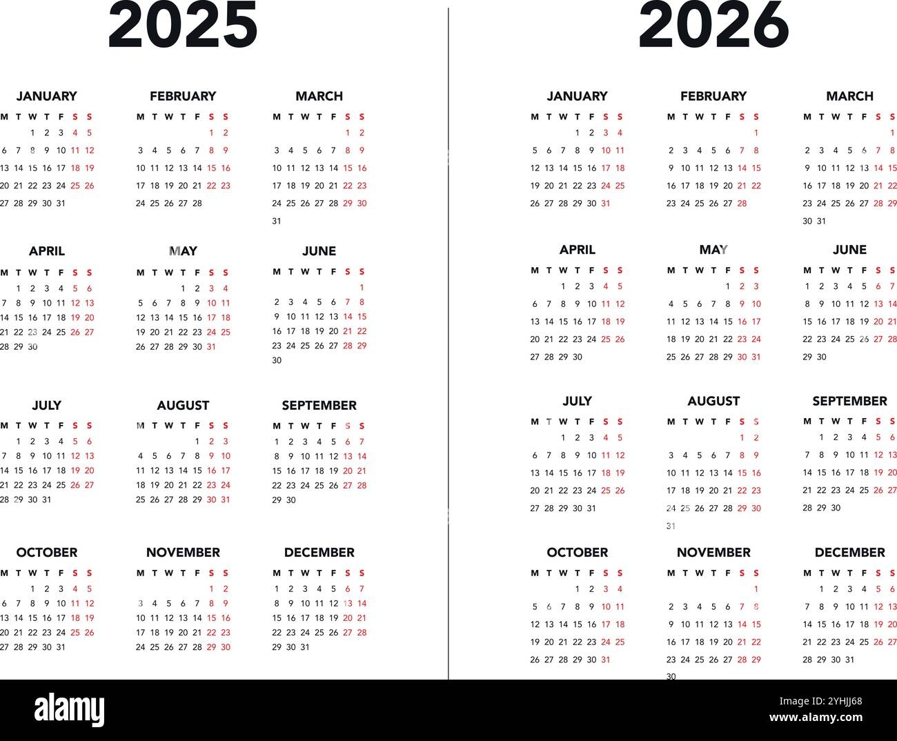 Calendar 2025 And 2026 Vector Templates Start Monday Simple Design Stock Vector Image Art Alamy