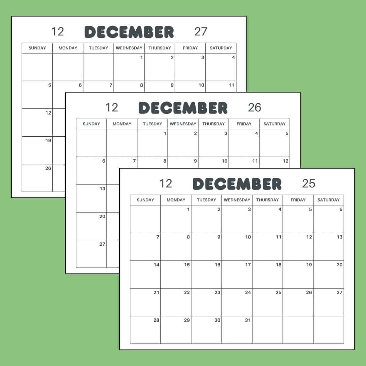 Free Printable December Calendar 2025 2026 2027 PDF Editable Canva Template
