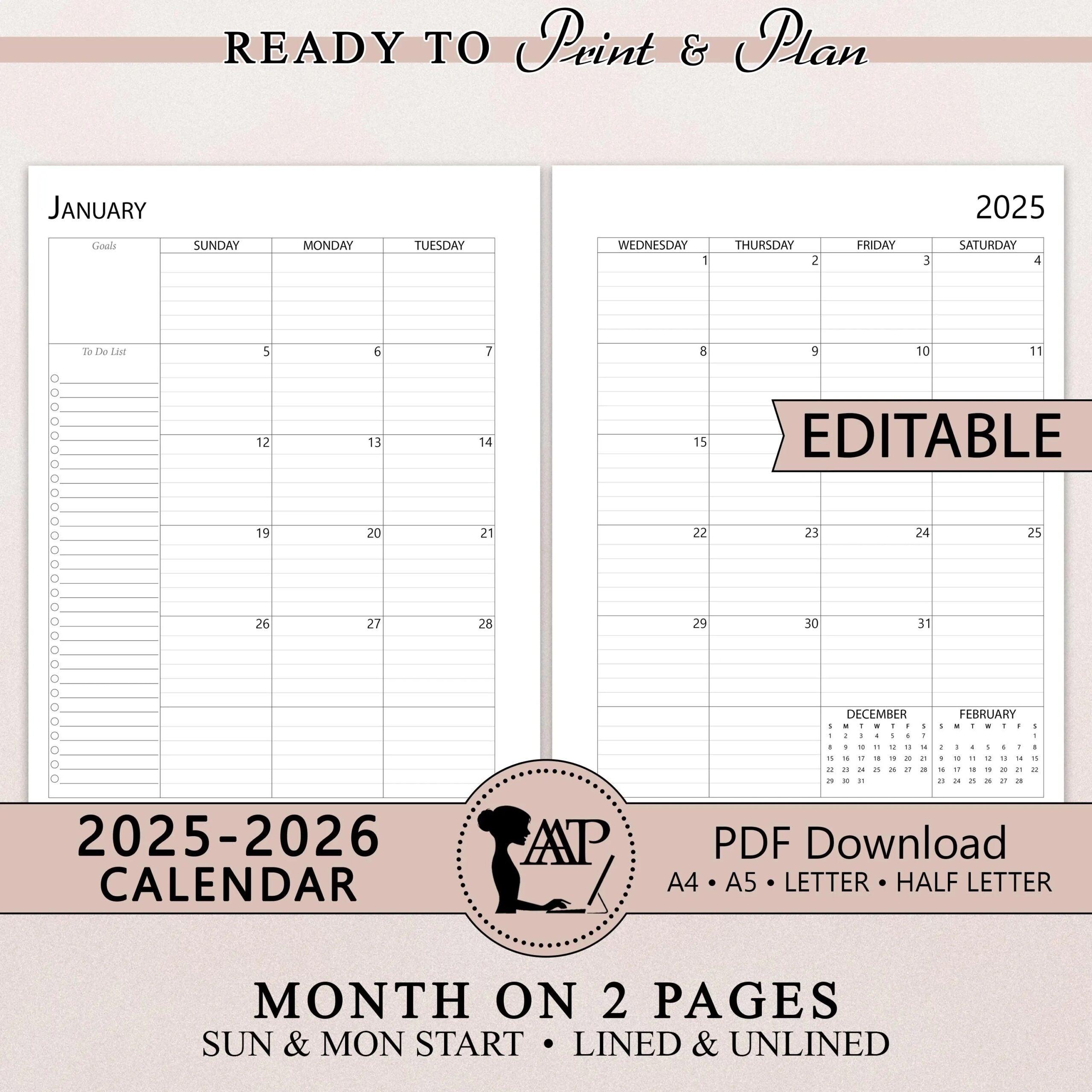 2025 2026 EDITABLE Calendar Printable Template Fillable Two 2 Page Lined Unlined Sunday Monday Start A4 A5 Half Letter PDF CLP01 04 Etsy