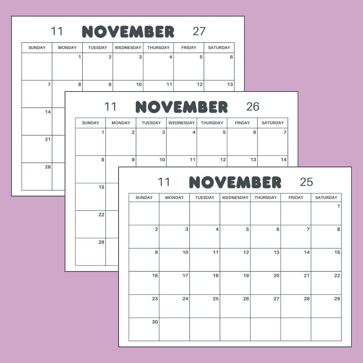 Free Printable November Calendar 2025 2026 2027 PDF Editable Canva Template