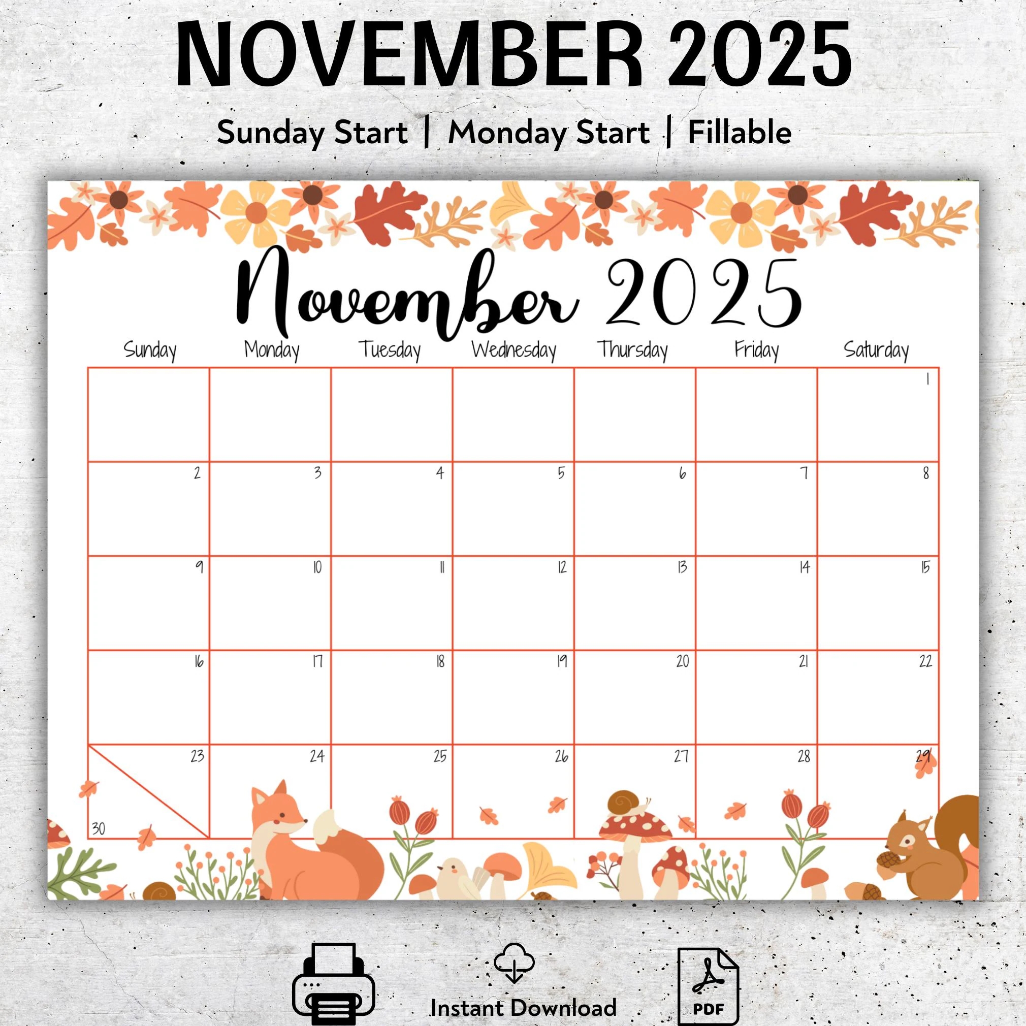 EDITABLE November 2025 Calendar Cute Watercolor Fox Forest Animal Calendar For Kids Printable Fillable Planner Kid s School Schedule Etsy