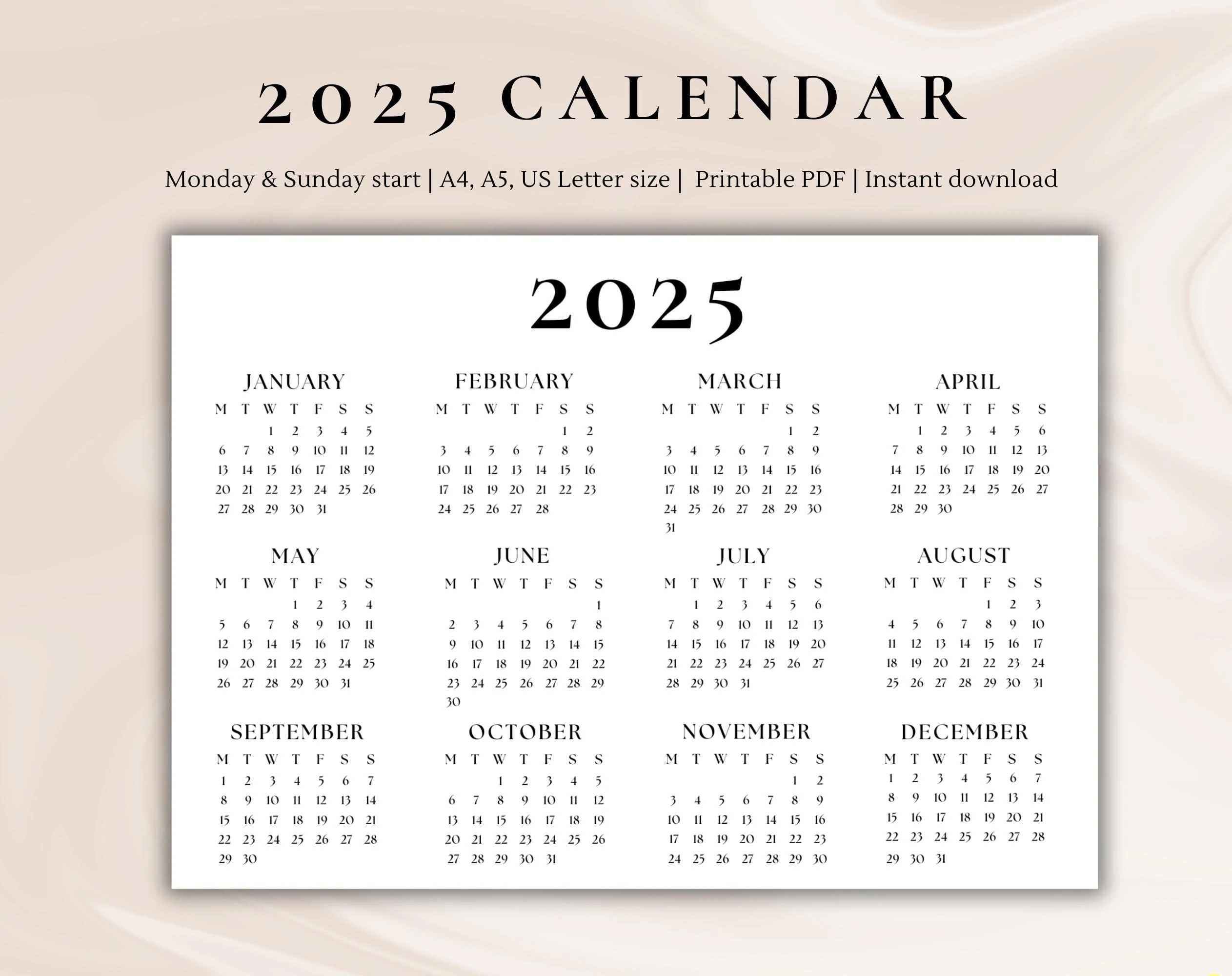 2025 Calendar Single Page Full Year Calendar Desk Calendar Wall Calendar Printable Calendar 2025 Planner Etsy