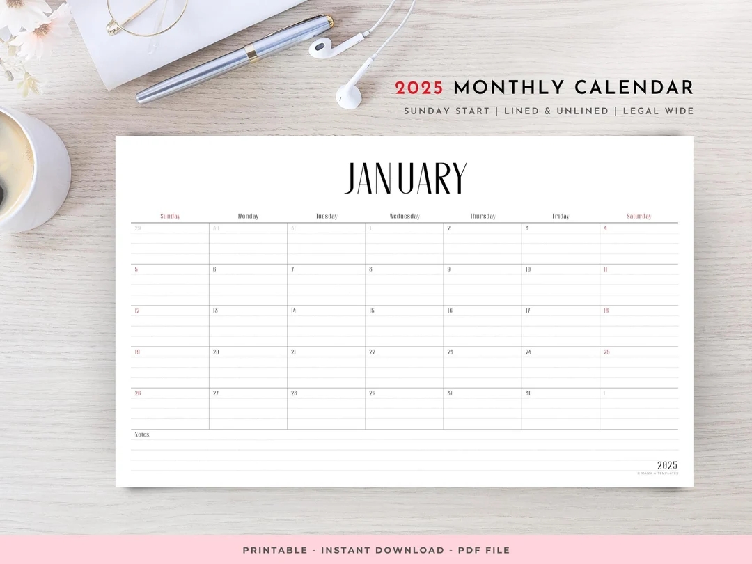 2025 Monthly Yearly Printable Wall Calendar Horizontal Legal Size 8 5 X 14 Sunday Start Lined And Unlined Simple Minimalist Design Etsy