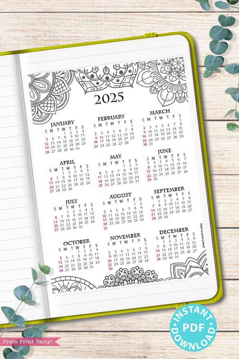 2025 One Page Calendar At a glance Printable Mandala