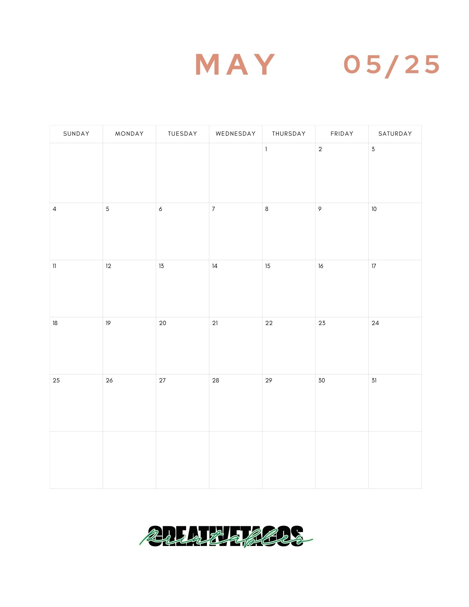 Minimalist Printable 2025 Monthly Calendar Template