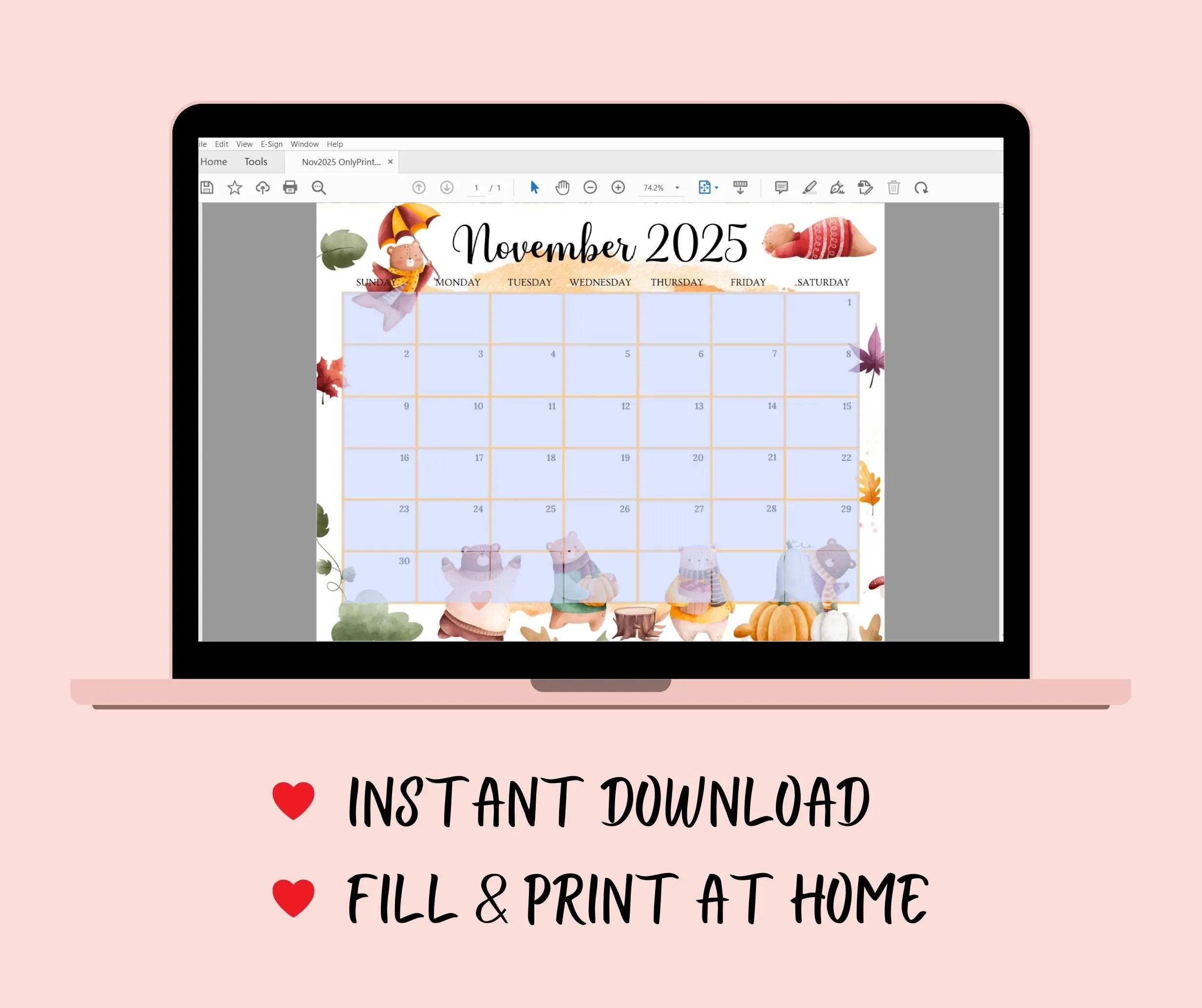EDITABLE November 2025 Calendar Beautiful Autumn Planner W cute Bears Printable Monthly Calendar For Kid Home Work Office Instant Download Etsy