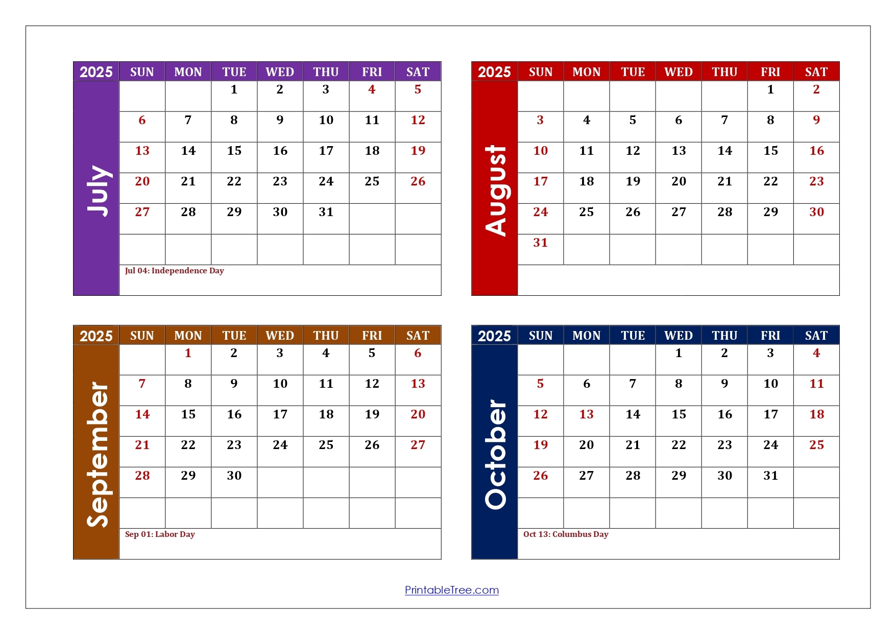 July To October 2025 Calendar Printable PDF Four Months Calendar