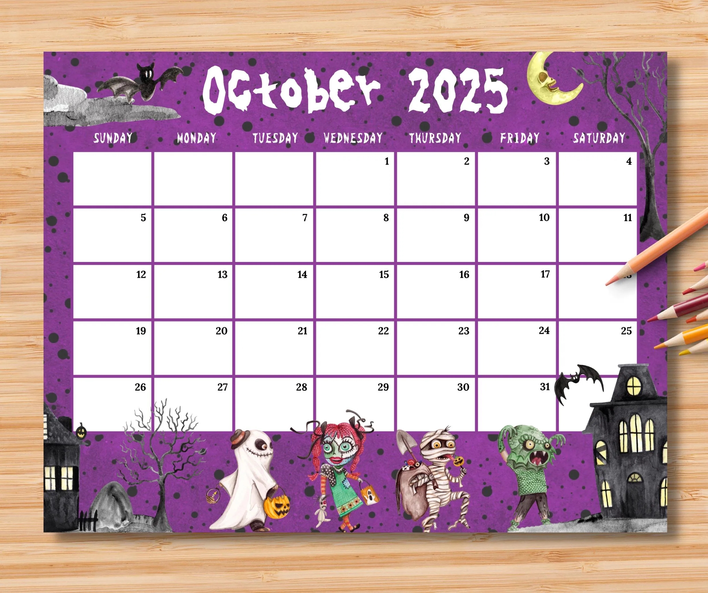 EDITABLE October 2025 Calendar Spooky Halloween Night Party Printable Monthly Calendar For Kids School Home Office Work Instant Download Etsy