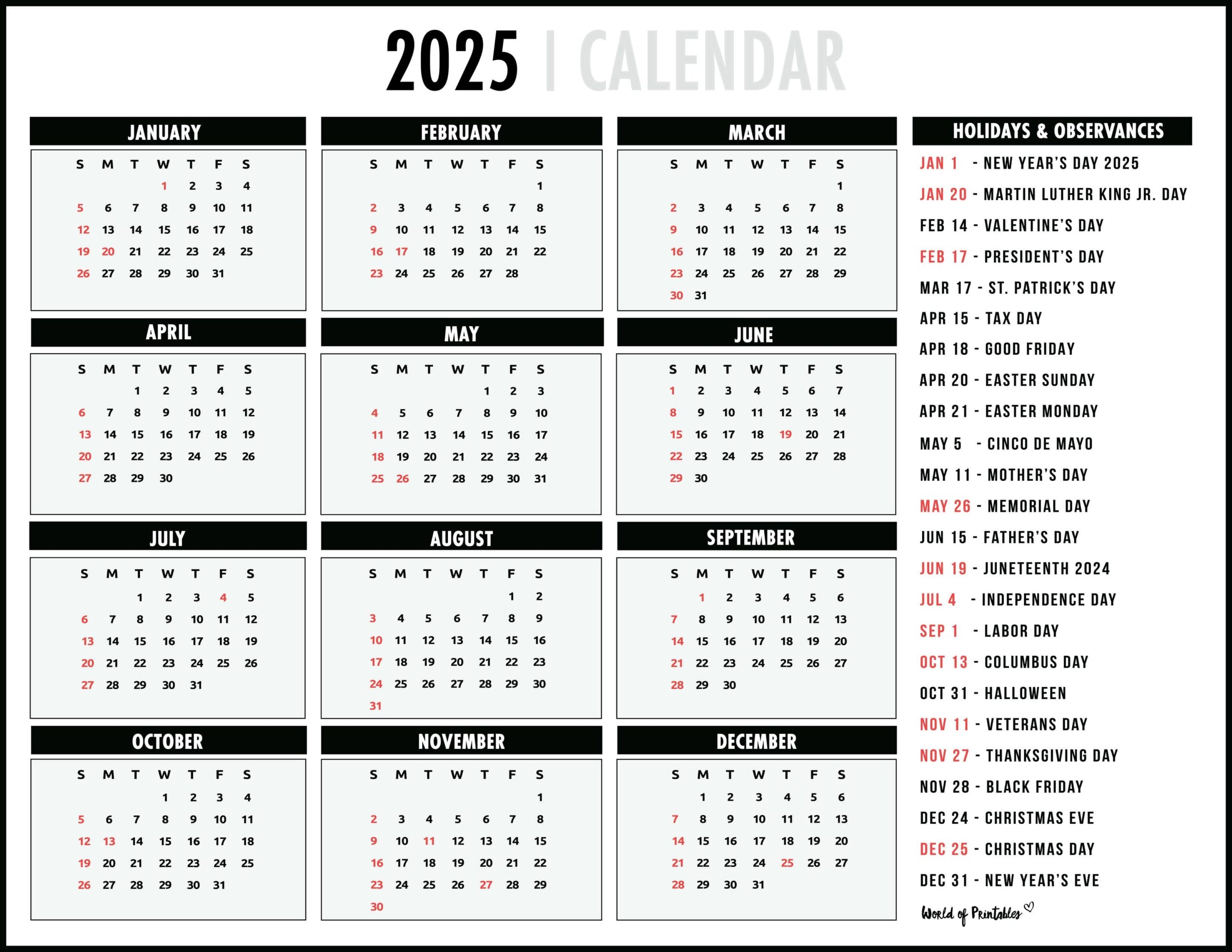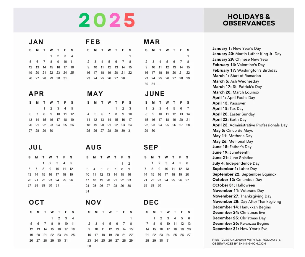 2025 Calendar With Holidays Free Printables In 28 Unique Styles World Of Printables