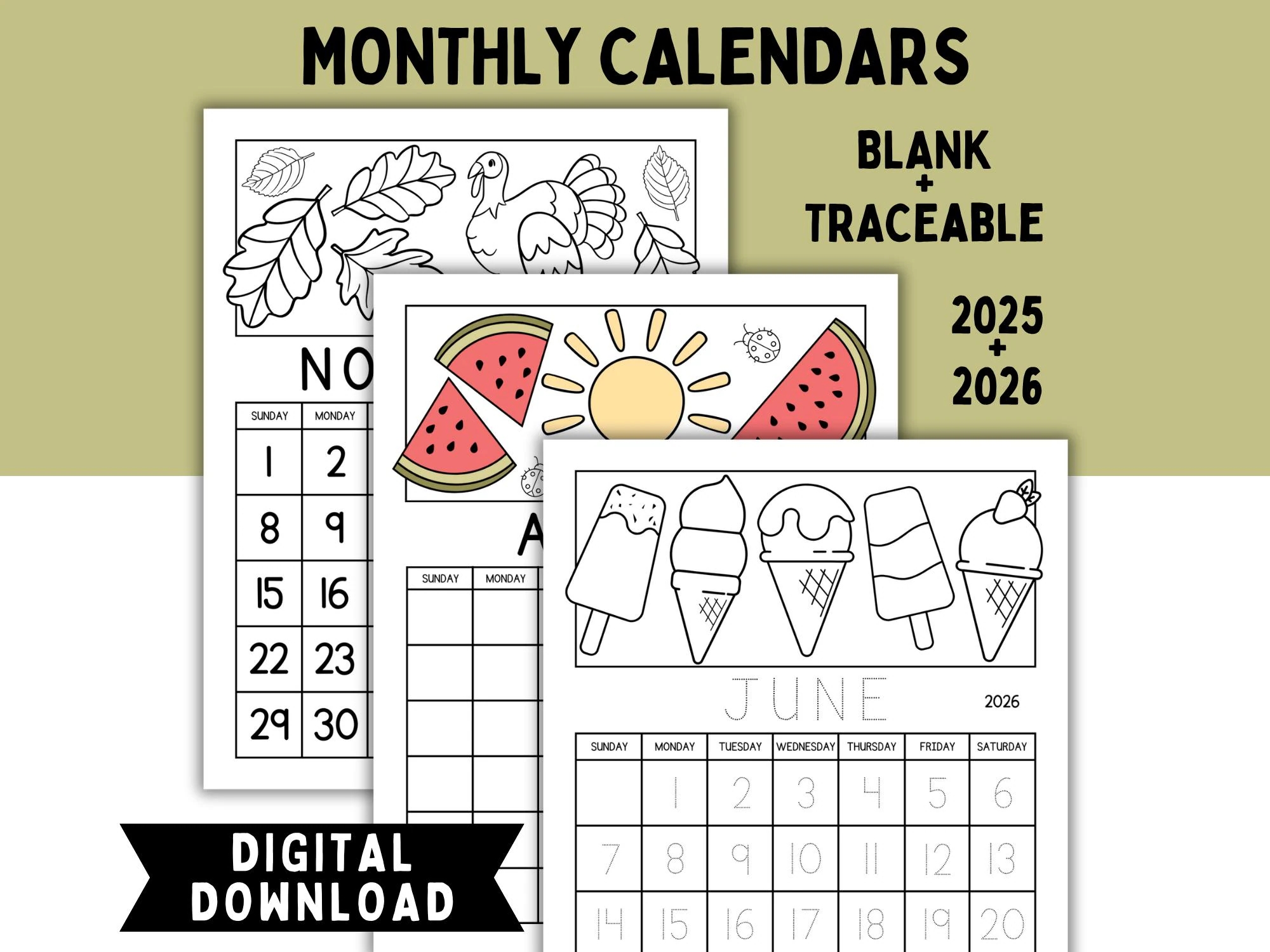 Monthly Calendar Printable Set Blank Reusable Templates July 2025 December 2026 Traceable Dates Full Year Kids Coloring Pages Etsy Canada