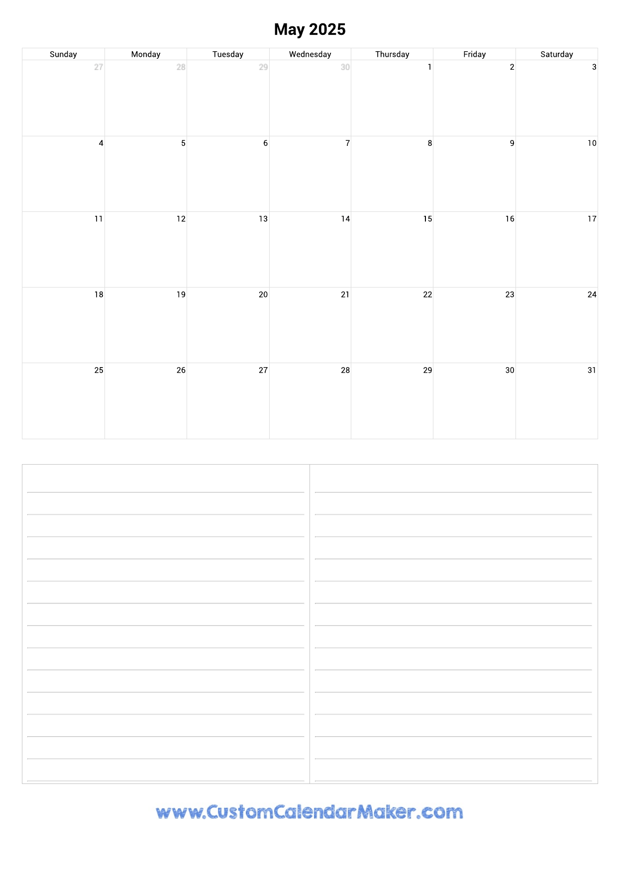 May 2025 Portrait Calendar With Notes Custom Calendar Maker