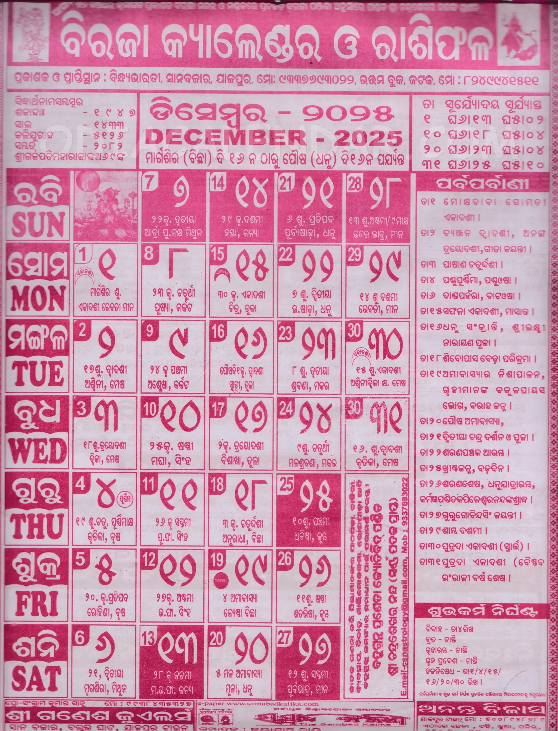 Biraja Odia Calendar December 2025 Festivals Auspicious Days And Holidays