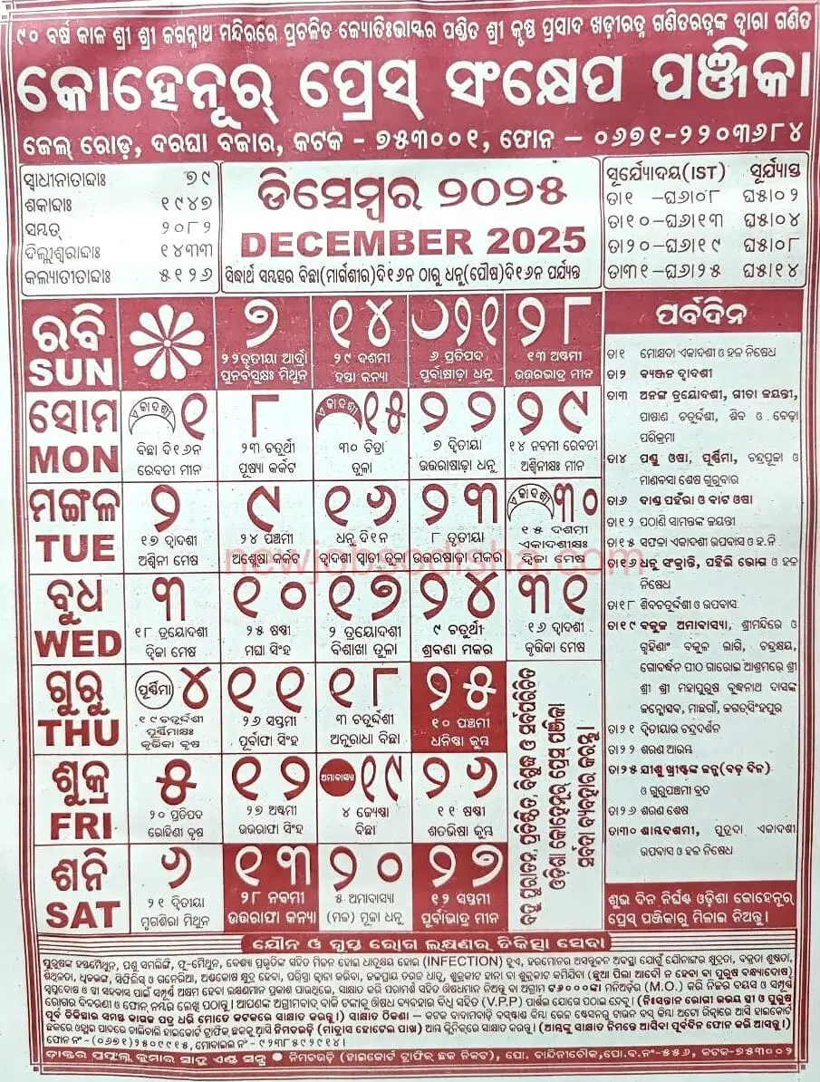 Kohinoor Odia Calendar December 2025 Festivals Auspicious Days And Holidays