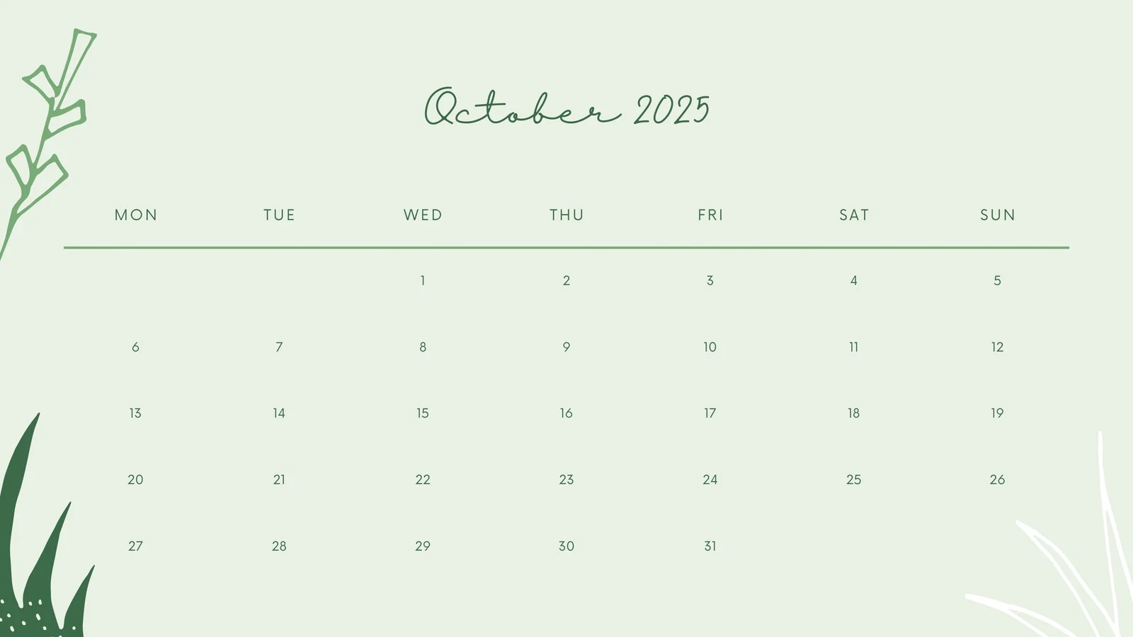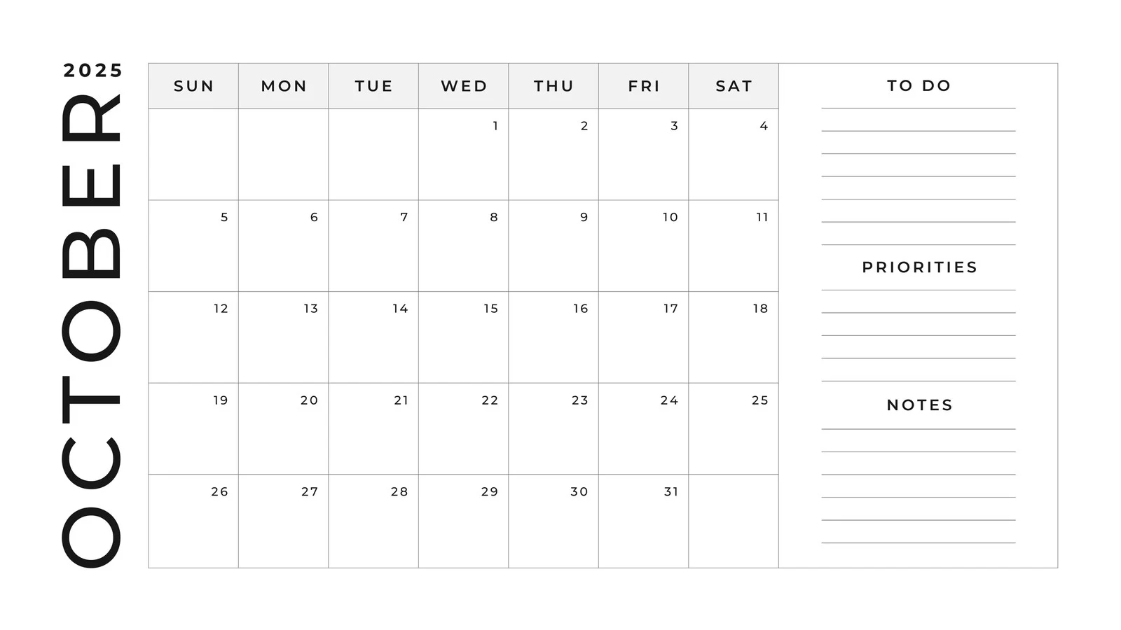 Monthly Blank October 2025 Calendar